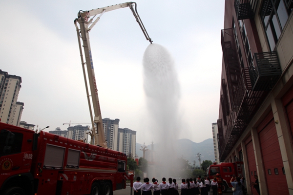 活動期間,同學們在消防員的帶領下認識了消防車輛以及各種消防救援裝備器材,并觀看了消防員日常訓練科目。當看見舉高噴射消防車從高空噴灑水柱、滅火偵察機器人在訓練場靈活轉動、消防員徒手爬繩上四樓時,同學們發出陣陣掌聲與驚呼。