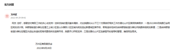 收到留言后,萬州區商務委員會針對群眾反映的問題進行了核實督辦,回復稱擬從三個方面做好相關工作方便北山片區居民購菜需求: