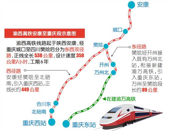 根據批復,渝西高鐵線路起于陜西安康,經重慶城口至四川樊噲后分為東西雙徑路,正線全長538公里,設計速度350公里/小時,工期6年,總投資約1213億元。其中,西徑路為安康經樊噲至北碚南,引入重慶西站,正線長約449公里,由西昆公司作為項目業主;東徑路為樊噲經開州接入既有萬州北站,銜接新建渝萬高鐵,引入重慶東站,萬州至樊噲段長約89公里,總投資約193億元,由重慶鐵路投資集團作為項目業主。