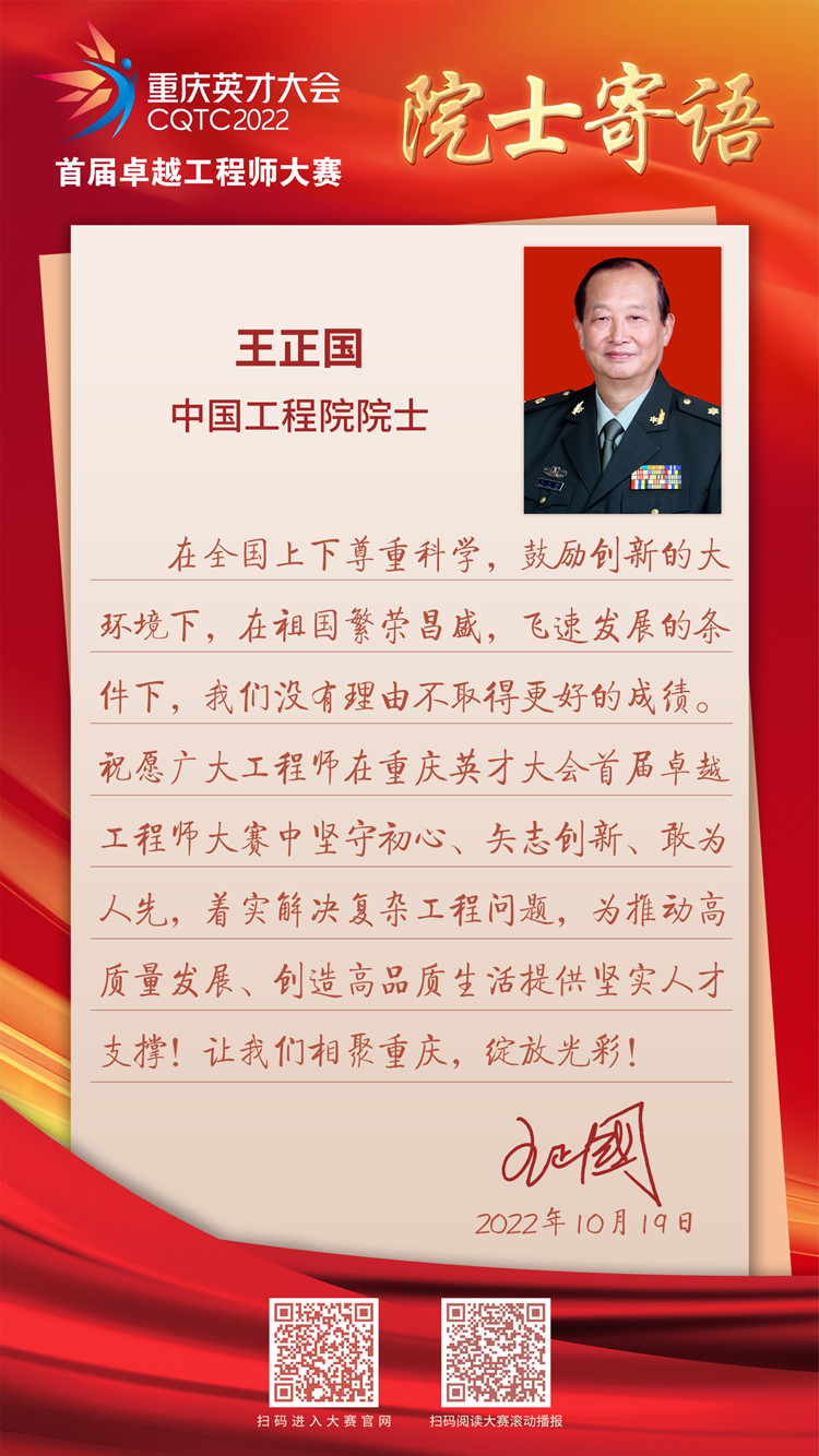 10月19日,中國工程院院士王正國向2022重慶英才大會首屆卓越工程師大賽發來寄語:在全國上下尊重科學,鼓勵創新的大環境下,在祖國繁榮昌盛,飛速發展的條件下,我們沒有理由不取得更好的成績。祝愿廣大工程師在重慶英才大會首屆卓越工程師大賽中堅守初心、矢志創新、敢為人先,著實解決復雜工程問題,為推動高質量發展、創造高品質生活提供堅實人才支撐!讓我們相聚重慶,綻放光彩!