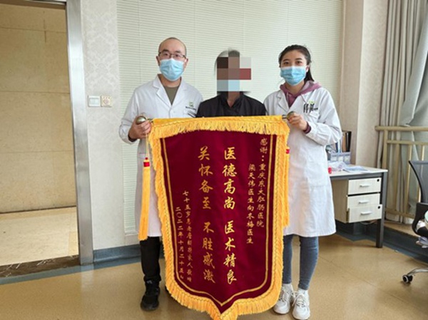 近日,75歲詹婆婆將一面寫有“醫德高尚醫術精良,關懷備至不勝感激”的錦旗,送到重慶東大肛腸醫院醫生梁天偉和醫助向冬梅手中,以此表達對全體醫護人員的衷心感謝。