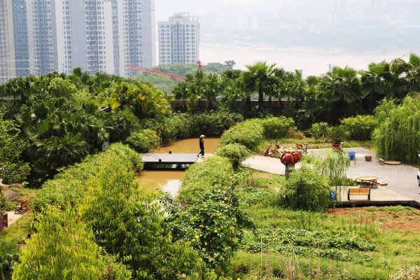 這個“屋頂農場”位于南岸區白鶴路美心集團一棟33米高的辦公樓頂上,是一片2萬多平方米的綠地,種滿荷花、水稻、絲瓜、茄子、南瓜、紅薯,以及鐵樹、檳榔等20多種觀賞性植物,綠地四周環繞著一條長約1公里的人工河,河里養有魚蝦,不少市民稱它為“空中花園”“都市田園”,美心員工叫它“開心農場”。