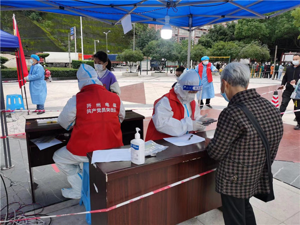 在開州,分公司組織黨員先鋒隊20人下沉到明鏡石社區參與疫情防控工作,配合社區累計完成超700戶2000余人核酸檢測工作。