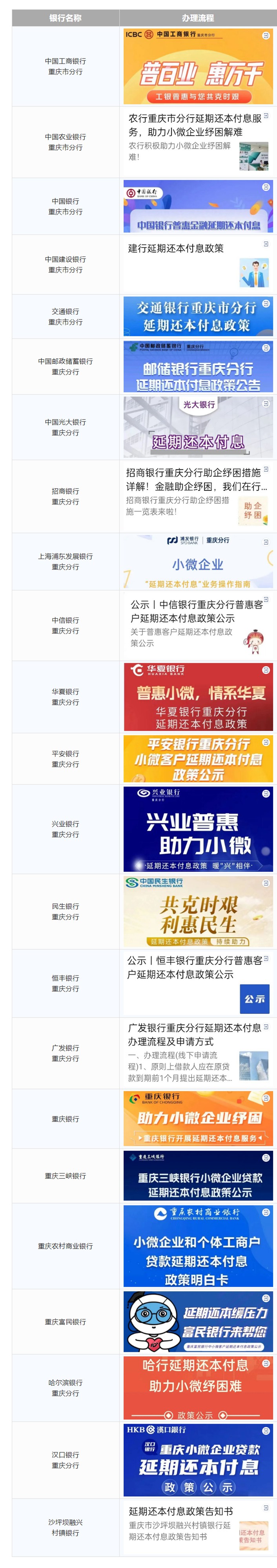 以下為重慶銀保監局公眾號“渝小金”發布的重慶各商業銀行機構延期還本付息申請方式和辦理流程: