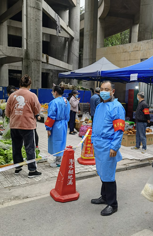 菜市場經營戶眾多、流動人口密集,是抗疫中容易發生交叉感染的區域,陳明祥主動請戰,全程參與菜市場防疫志愿服務,連續多日開展協助值勤值守、維持排隊秩序、居民出入登記排查等工作。