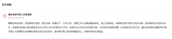 11月17日,重慶市奉節縣人力社保局回復網友稱:11月15日,經該局協調,安裝單位負責人表示在2022年11月30日前支付喻女士1萬元,并承諾余款在2023年1月20日前付清。