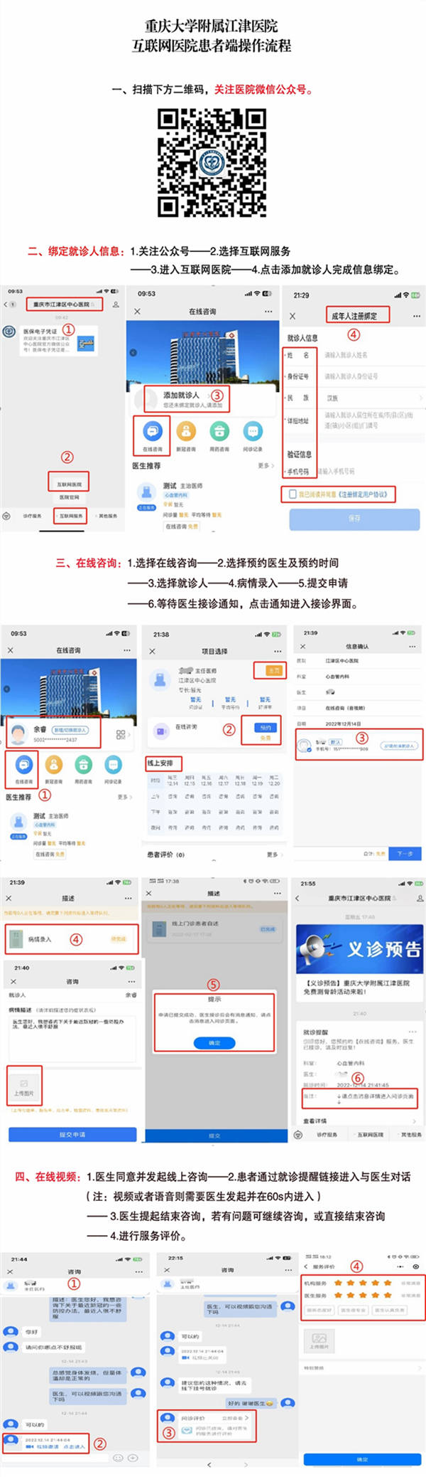 為進一步滿足市民朋友就醫需要,加強優質醫療服務保障,12月15日,重慶大學附屬江津醫院(江津區中心醫院)正式開通互聯網醫院視頻問診功能。市民只需通過手機,足不出戶就可享受醫生的咨詢服務。