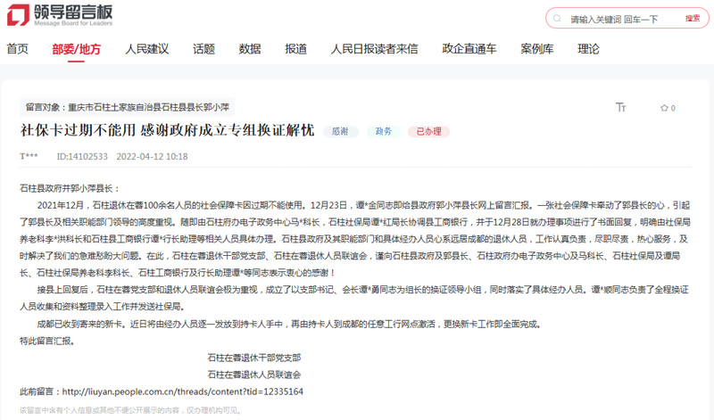 想群眾之所想,急群眾之所急,解群眾之所難。2022年初,百余位退休老人通過人民網“領導留言板”反映,他們從重慶市石柱土家族自治縣退休后,一直隨子女生活居住在成都。因為社??ㄟ^期不能使用,如果都返回石柱辦理社???,對老人而言尤其不方便,想咨詢可否銜接成渝雙城通辦解決?