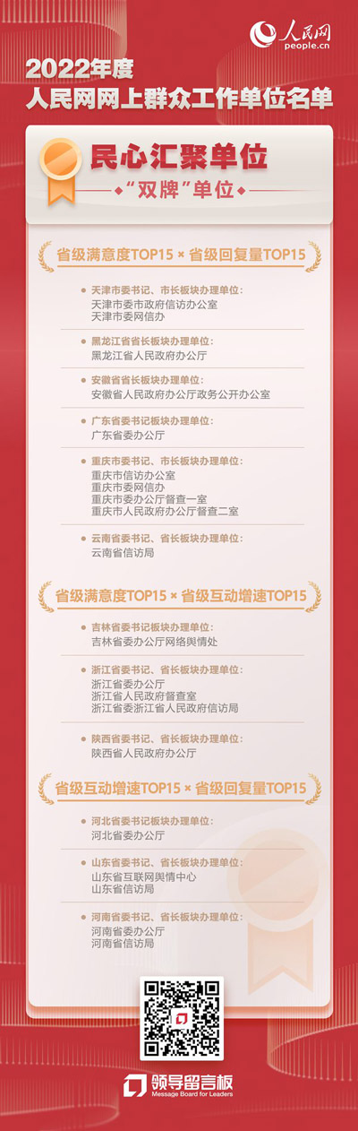 值得點贊的是,重慶市委書記、市長板塊辦理單位(重慶市信訪辦公室、重慶市委網信辦、重慶市委辦公廳督查一室、重慶市人民政府辦公廳督查二室)再次入圍2022年度人民網網上群眾工作民心匯聚單位。