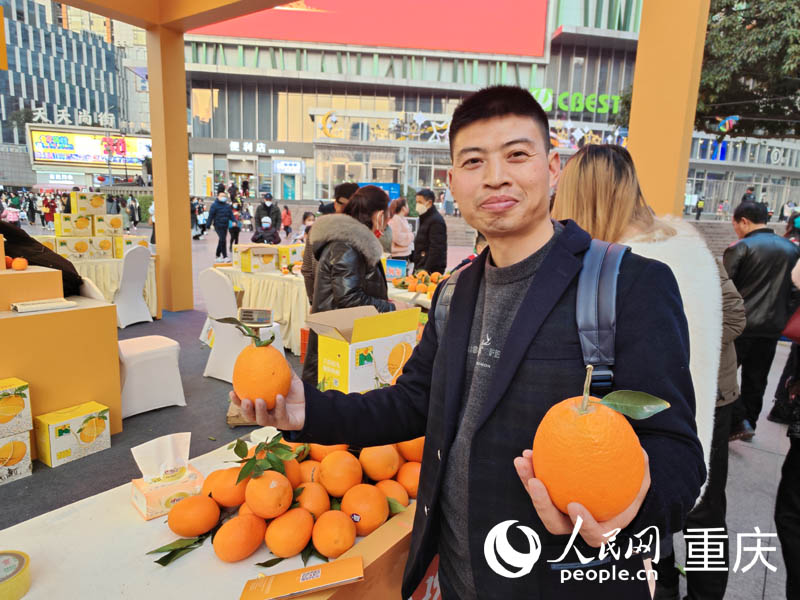 1月6日,楊守江在“橙博會”現場,宣傳奉節臍橙。人民網 陳琦攝