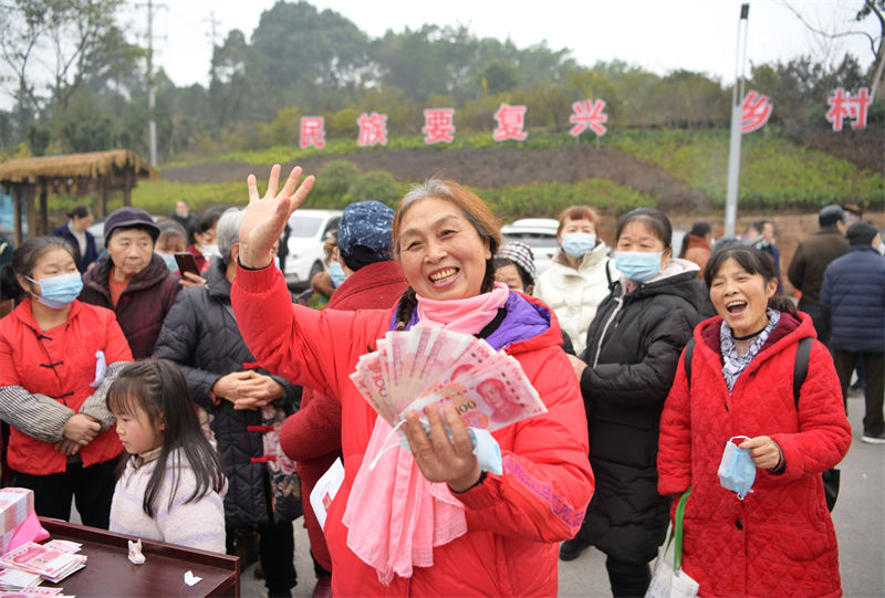 重慶南岸放牛村村民喜領分紅。郭旭攝