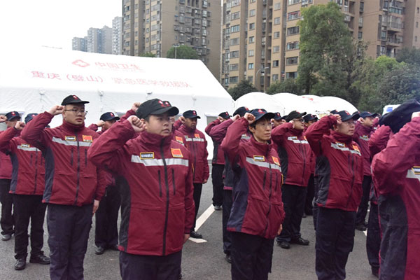 重慶(璧山)緊急醫學救援隊全體隊員宣誓。璧山區衛生健康委供圖