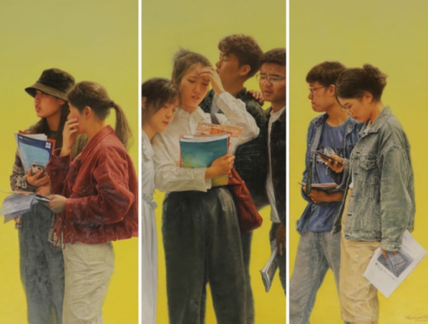 《金色的季節》作品畫面以黃色調為主,青年學子成為主角。其作者張宏偉為重慶三峽學院美術學院院長,他回憶,該作品是他在學校一次招聘會采風時找到的靈感,學生們朝氣蓬勃、對未來充滿期待的積極狀態深深打動他。