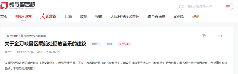 網友在留言中說道,他是來自甘肅蘭州的一位游客,在重慶金刀峽景區游玩時,景區乘船處循環播放流行歌曲《早安隆回》,于情于景并不妥,考慮附近石柱上刻有《俠客行》,建議景區可播放王三溥先生的《俠客行》更為襯景。并表示希望重慶越來越好,于細節處見真章!