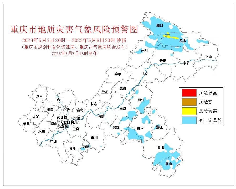 5月7日16時,重慶市規劃和自然資源局、重慶市氣象局聯合發布全市地質災害氣象風險預警。