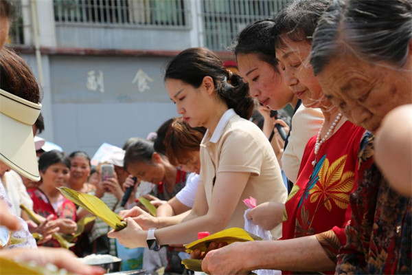 吃粽子是端午節的習俗之一,節目表演告一段落,包粽子比賽開始??诹畎l出后,選手們迅速進入狀態,卷粽葉、填餡、壓實、封口、扎捆,動作一氣呵成。轉眼間,一個個清香、鮮綠的粽子就成型了。隨后,志愿者們將粽子送到社區居民家中,為他們送去節日的祝福。