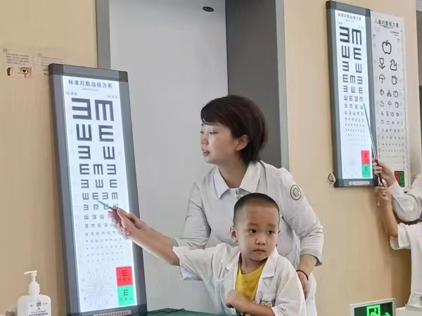 科普環節結束后,醫學之旅開始,眼科門診處,“小醫生”正式上崗。在專業醫師的帶領下,“小醫生”們輪流充當患者和醫生的角色開始了視力測試。跟著視力測試棒的指示,小朋友大聲地答出視標“E”的缺口方向,一旁的醫護人員仔細記錄著測試數據。