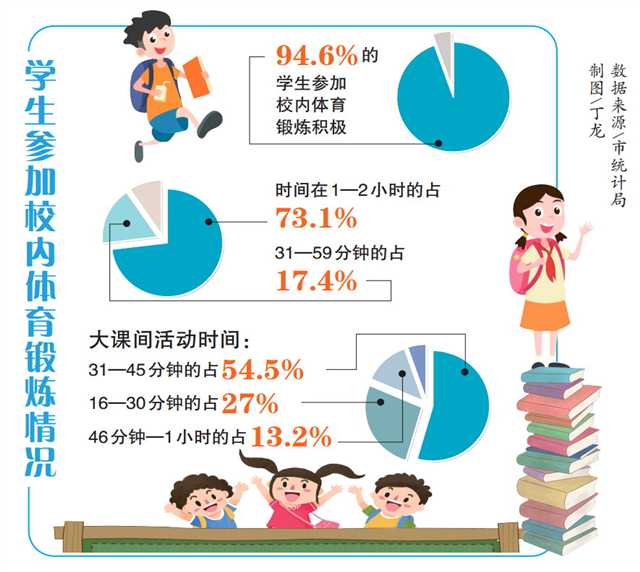 報告稱,隨著全市嚴格落實學校體育課程開設要求,體育課程開課率、大課間體育活動開展率、學校保健操普及率均達到100%。有94.6%的學生參加校內體育鍛煉積極。學生參加體育活動的時間在1—2小時的占73.1%,31—59分鐘的占17.4%。學校每天安排的大課間活動時間主要在31—45分鐘,占比為54.5%,16—30分鐘的占27%,46分鐘—1小時的占13.2%。大課間活動主要有廣播體操(占90.4%)、眼保健操(占80.2%)、跑步(占86.2%)、跳繩踢毽子(占56.9%)等。