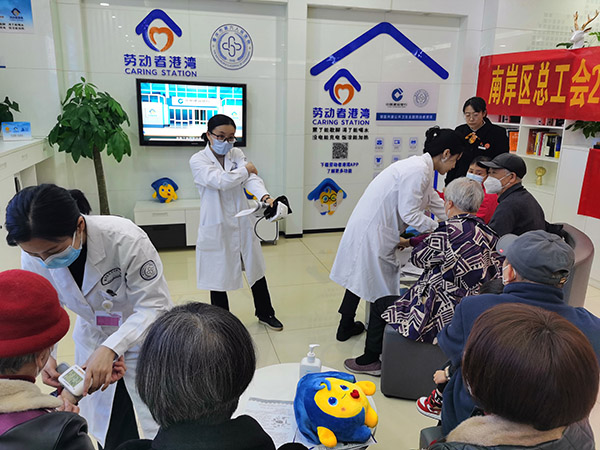 “聽說這里可以免費檢查血壓和體重,這是真的嗎?”“這位阿姨,我們這個港灣是專門打造的‘健康加油站’,體檢常用物品都有?!?/p>