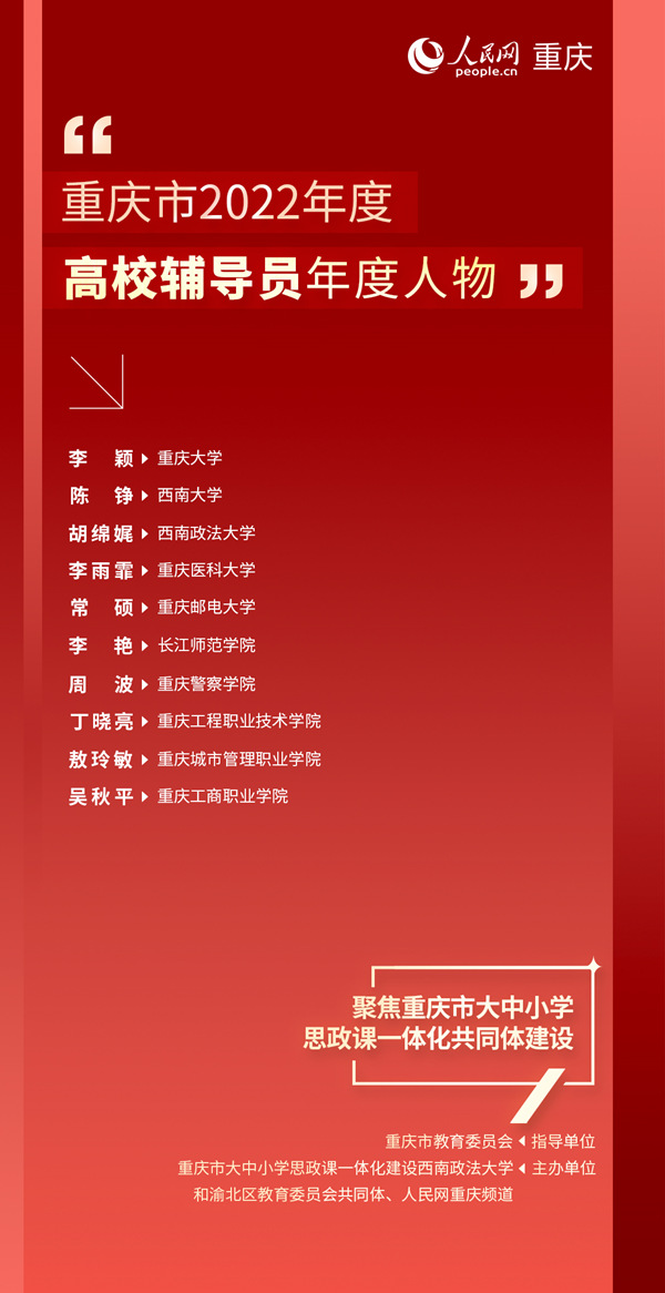 名單涵蓋五大類別,最終評選出2022年重慶市高校輔導員年度人物10名、2022年重慶市高校思想政治理論課教師年度人物10名、2022年重慶市高校心理健康教育年度人物5名、2022年重慶市高校優秀輔導員20名、2022年重慶市高校優秀思想政治教育工作者20名。