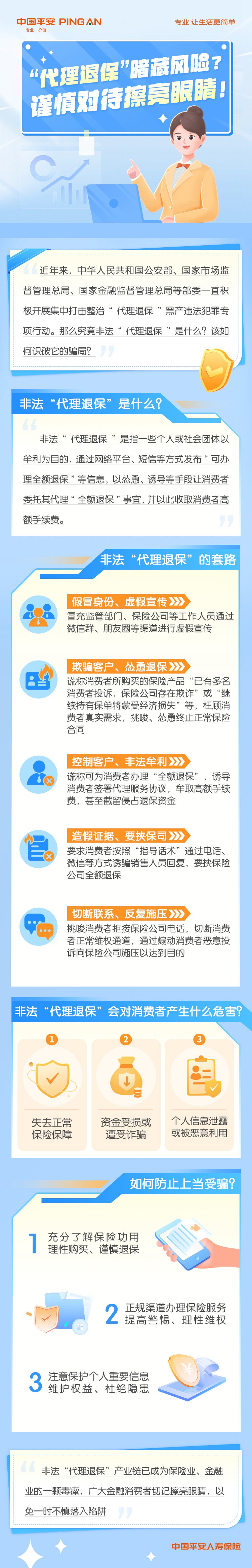 近年來,國家一直積極開展集中打擊整治“代理退?!焙诋a違法犯罪專項行動。那么,究竟非法“代理退?!笔鞘裁??該如何識破它的騙局?2023年“金融消費者權益保護教育宣傳月”活動期間,平安人壽重慶分公司面向廣大市民朋友推出“金融消費者權益保護教育宣傳月”消保知識小課堂系列。本期分享主題為:《“代理退?!卑挡仫L險 謹慎對待擦亮眼睛》。(平安人壽重慶分公司)
