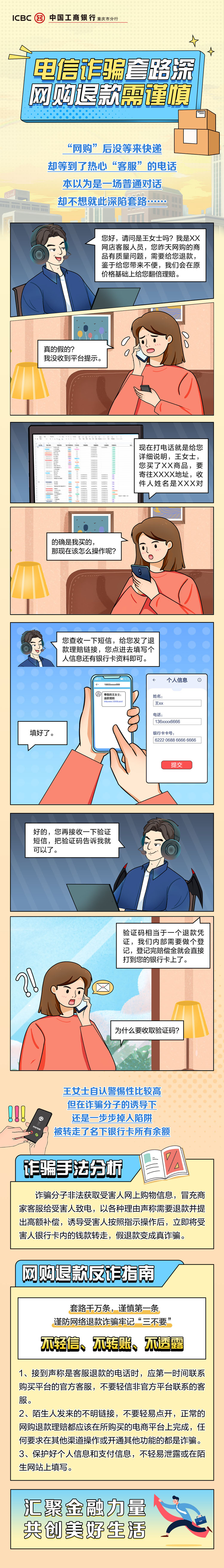 “網購”后沒等來快遞,卻等到了熱心“客服”的電話;本以為是一場普通對話,卻不想就此深陷套路……工行重慶市分行提醒廣大消費者:不輕信、不轉賬、不透露。接到聲稱客戶退款的電話時,應第一時間聯系購買平臺的官方客服,不要輕信非官方平臺聯系的客服。陌生人發來的不明鏈接,不要輕易點開。保護好個人信息和支付信息,不輕易泄露或在陌生網站上填寫。(張睿)