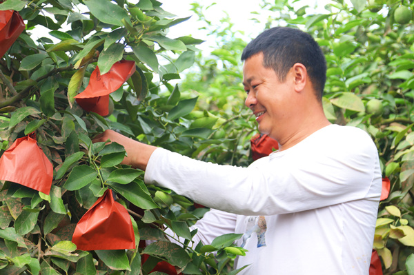 在潼南區益達檸檬種植園里,廖磊忙碌著給檸檬套袋。張睿攝
