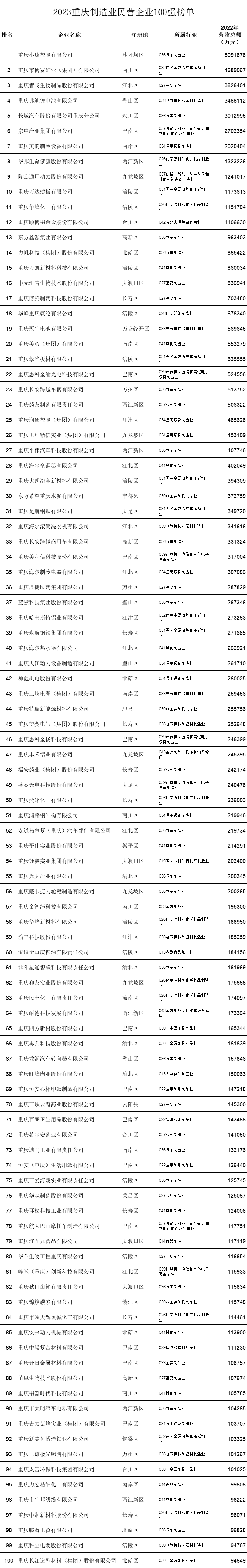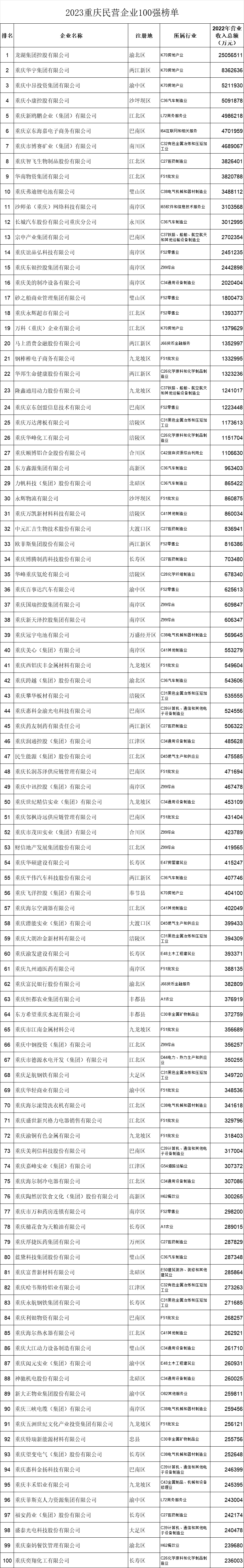 附:重慶市民營企業100強榜單、2023重慶制造業民營企業100強榜單、2023重慶民營企業科技創新指數100強榜單。