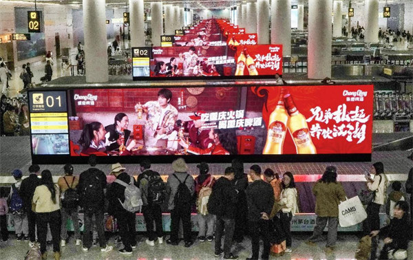 搶抓旅游復蘇契機,在中秋國慶假日期間,重慶啤酒旗下樂堡、重慶、烏蘇、西夏、風花雪月品牌分別“包”下旅游熱點城市重慶、貴陽、烏魯木齊、庫爾勒、銀川、麗江、昆明、西雙版納和大理等機場到達大廳LED大屏。這些品牌與城市文化高度契合,成為了游客落地之后對這座城市的第一印象。