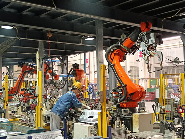 占地面積約40畝的廠區,一片井然有序、欣欣向榮的景象。在沖壓車間,伴隨陣陣作業聲響,原本筆直的鋼板變成了車殼、機蓋等部件;焊接車間,幾十臺點焊機器人正揮舞著“手臂”,電光石火間,器具嚴絲合縫;倉庫內,工人們有條不紊地組裝、打包,一塊塊銀色汽車內板部件整裝待發……
