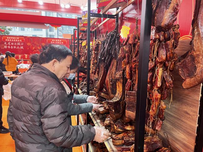 眼下正是置辦年貨的時候,市民吳秀清正在展銷會上購買臘肉,“看色澤、聞味道,我們一般都會選擇城口老臘肉,品質、味道有保障?!?/p>