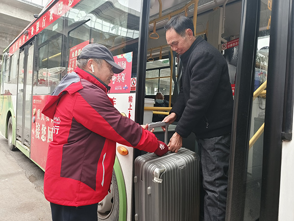 重慶農商行云陽支行志愿者為務工返鄉人員安排轉運大巴、搬運行李。重慶農商行供圖