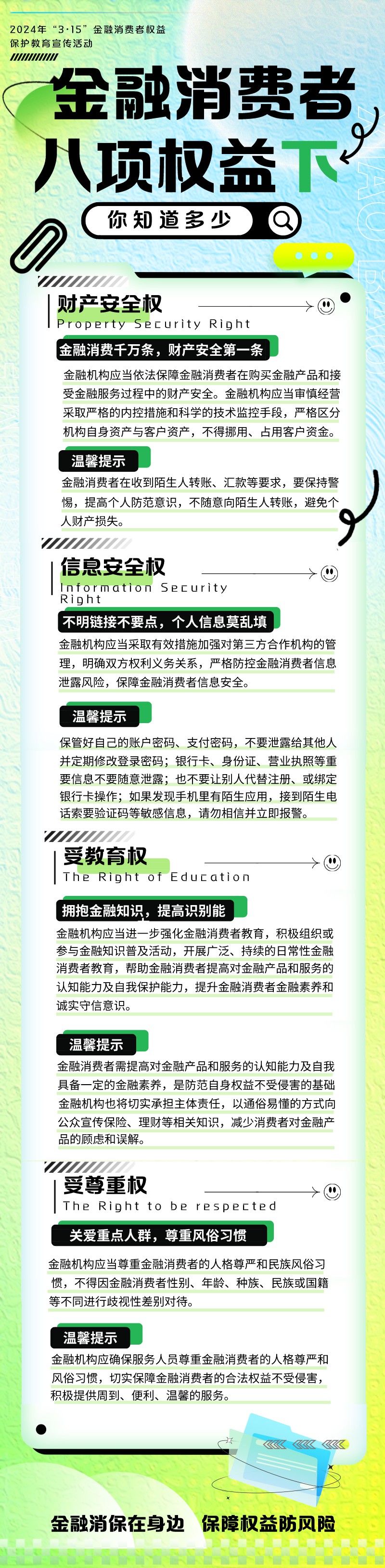 3月4日—3月15日,國家金融監督管理總局重慶監管局開展以“金融消保在身邊 保障權益防風險”為主題的2024年重慶“3·15”金融消費者權益保護教育宣傳周活動。為做好金融消保知識宣傳教育,切實提升群眾金融素養和風險防范意識,平安人壽重慶分公司積極響應監管部署,推出金融消保課堂系列分享。本期分享主題為:《聚焦“3·15”|金融消費者八項權益你知道多少(下)》。(平安人壽重慶分公司)