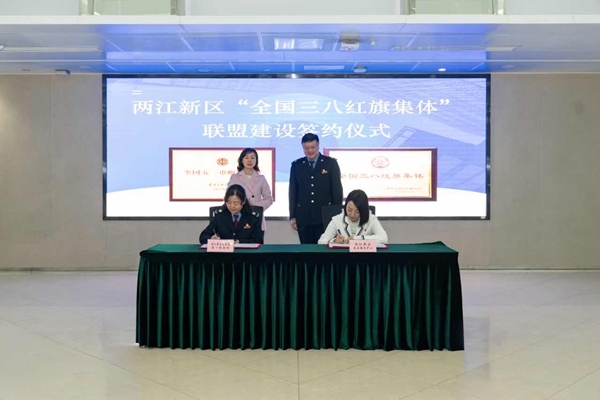 兩江新區政務服務中心和兩江新區稅務局簽訂“全國三八紅旗集體”聯盟建設行動書。郭睿攝