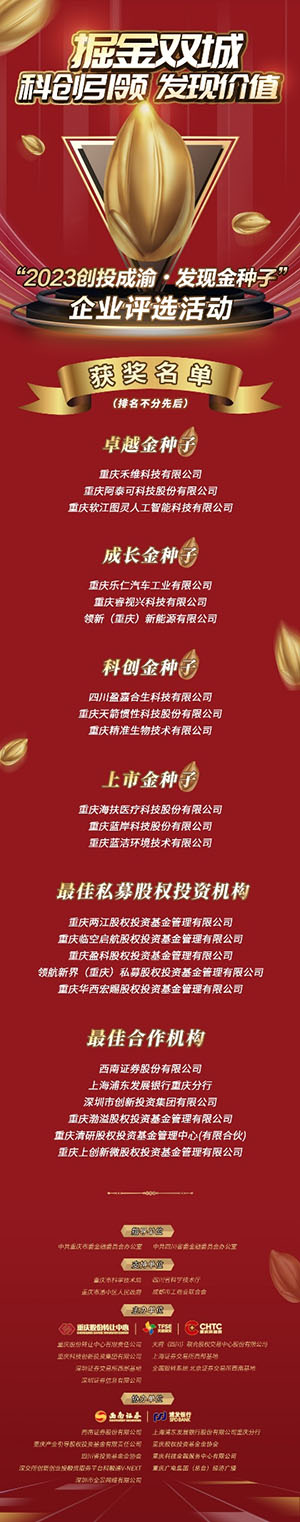 3月21日,“2023創投成渝·發現金種子”企業評選活動頒獎儀式舉行,重慶藍潔環境技術有限公司、四川盈嘉合生科技有限公司、重慶天箭慣性科技股份有限公司等12家企業榮膺“金種子”獎項,重慶兩江股權投資基金管理有限公司、西南證券股份有限公司等11家金融投資機構獲得機構類獎項。