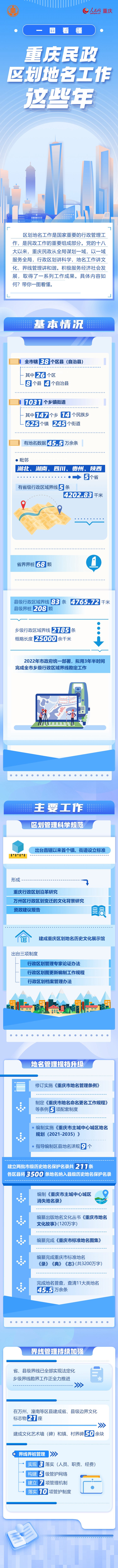 區劃地名工作是國家重要的行政管理工作,是民政工作的重要組成部分。黨的十八大以來,重慶民政從全局謀劃一域,以一域服務全局,行政區劃講科學,地名工作講文化,界線管理講和諧,積極服務經濟社會發展,取得了一系列工作成果。具體內容如何?帶你一圖看懂。(夏金梅)
