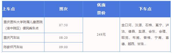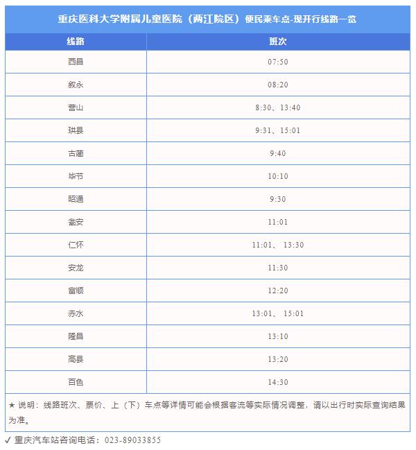 此外,重慶汽車站為滿足旅客出行需求,4月7日起,恢復重慶醫科大學附屬兒童醫院(兩江院區)便民乘車點部分線路,現開行線路如下: