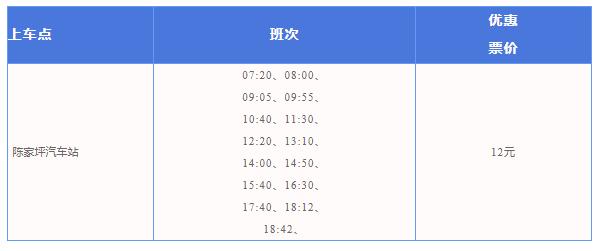 此外,陳家坪汽車站至江津班線調整發車時間,增加發班班次,繼續執行優惠票價12元。