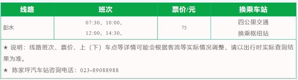 陳家坪汽車站至四公里交通換乘樞紐站換乘線路新增“彭水”班線,每天暫定發班4個班次,其票價、線路班次等詳情如下: