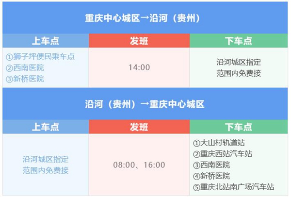 城際快客“重慶往返沿河(貴州)”為9座商務車,單程票價120元/人起。該線路在重慶主城多點約客上(下)車,途經多個醫院、軌道站等,在沿河指定范圍內免費接送,其站點、班次等如下: