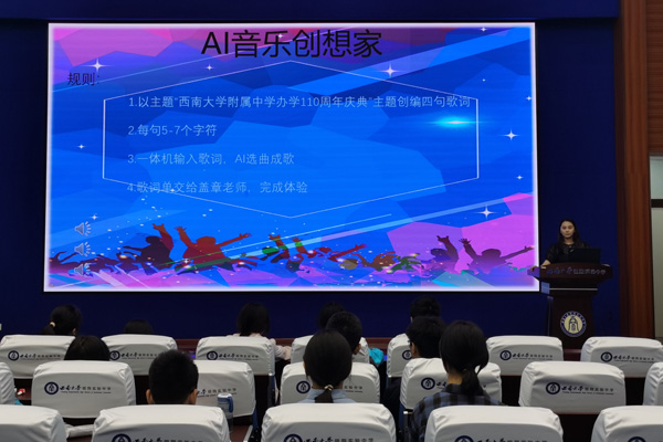 3D打印、機器人等現代科技發展的豐碩成果是孩子們關注的焦點,陶藝、中醫、投壺、活字印刷、艾草香囊等傳統技藝同樣也吸引著學生的興趣,孩子們在寓教于樂中真切地體會到了科技帶來的魅力。在現場,人氣最高的屬“牙齒拉車”“陶藝制作”“人工智能AI音樂制作”三個活動區域?!把例X拉車”,顧名思義即用“牙齒”去拉動一輛汽車。孩子們要“戰勝”的“對手”是一輛重約1.5t,即3000斤的家用小汽車,現場學生們的第一反應便是“難道不會把牙崩了嗎?”原來,物理組的郭鵬老師是利用了“滑輪組可以省力”這一初中物理原理,讓拉動小汽車的所需之力變為原來的1/54,以小克大,以弱勝強,以牙拉車,看似不可能完成的挑戰也能輕松拿下。在“陶藝制作”區,同學們圍攏在拉坯塑形工具旁,觀摩聆聽西南大學專家的示范和講解,之后,大家紛紛上手實踐,感受陶藝這一古老文化的魅力。在AI作曲區,音樂組的楊雪老師帶領同學們為西南大學附屬中學建校110周年校慶寫下發自肺腑的歌詞,通過AI技術創作各種曲風的樂曲,為校慶獻上一首首優美動聽的旋律。