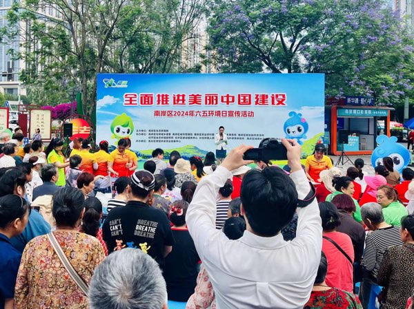 5月31日上午,重慶市南岸區長生橋鎮金科世界城永輝超市前,歌聲飛揚,以“全面推進美麗中國建設”為主題的六五環境日宣傳暨美麗重慶進社區活動,正在如火如荼地進行,現場吸引了500余名環保志愿者、長生橋鎮香溪社區居民代表及周邊群眾參與。