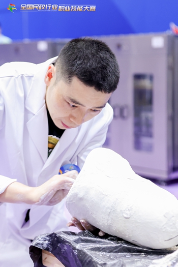 “這次比賽的考題可以說是我們日常工作中最常見、最基礎的工作之一,但并不意味著簡單?!睆垈フf,難點不在于技術難度有多刁鉆,而是需要基于自己的認識判斷、臨床經驗和熟練度。比如要充分結合假肢模特的情況,在限定時間內完成的同時注重各種細節,注重操作順序和規范,又快又好地完成一個石膏陰型大腿接受腔,并保證適配性,才能較好地完成比賽。最終,還要通過患者感受、裁判檢查和自述答辯來評判效果。