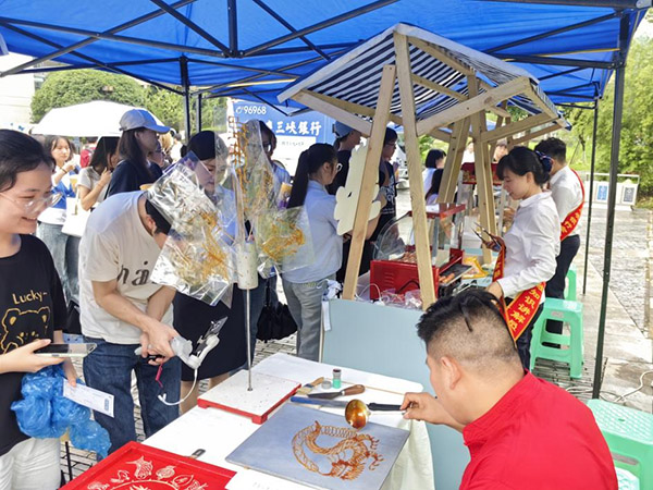 除了金融知識宣講,活動現場還設置了非遺文化體驗區。這里不僅有印有“守好錢袋”“慧眼識騙”“謹慎轉賬”等金融知識標識的拓板供學生們親身體驗,還有現場繪制的非遺糖畫、推拿等中醫非遺養生項目。此外,該行還設置了融合金融知識教育的蹴鞠、捶丸等傳統游戲互動環節,學生們參與游戲闖關即可贏取非遺文化周邊產品,提升了活動趣味性。