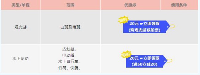 凡愉客行用戶購買合川觀光游產品、水上運動項目,有優惠券可享,先領券再下單購買,即可立省20元。針對在活動期限內消費的游客,還能在消費后分別返價值40元(滿100立省40)、20元(滿50立省20)的優惠券,適用于合川觀光游、水上運動項目等。