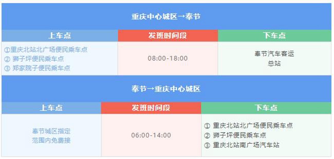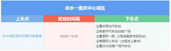 到奉節的城際快客,重慶中心城區多點約下車,“奉節→重慶中心城區”方向在奉節城區指定范圍內免費接。重慶北站南廣場汽車站、重慶汽車站(菜園壩)到赤水的定制班車也已開通。(愉客行)