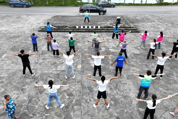 保合村活動廣場,實踐團成員教村民練習“八段錦”。陳思穎 攝