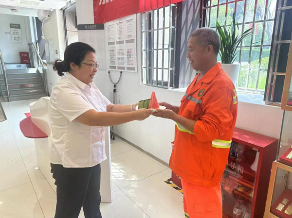 江北支行為辦理業務的客戶和納涼的環衛工人提供降溫的西瓜。工行重慶市分行供圖