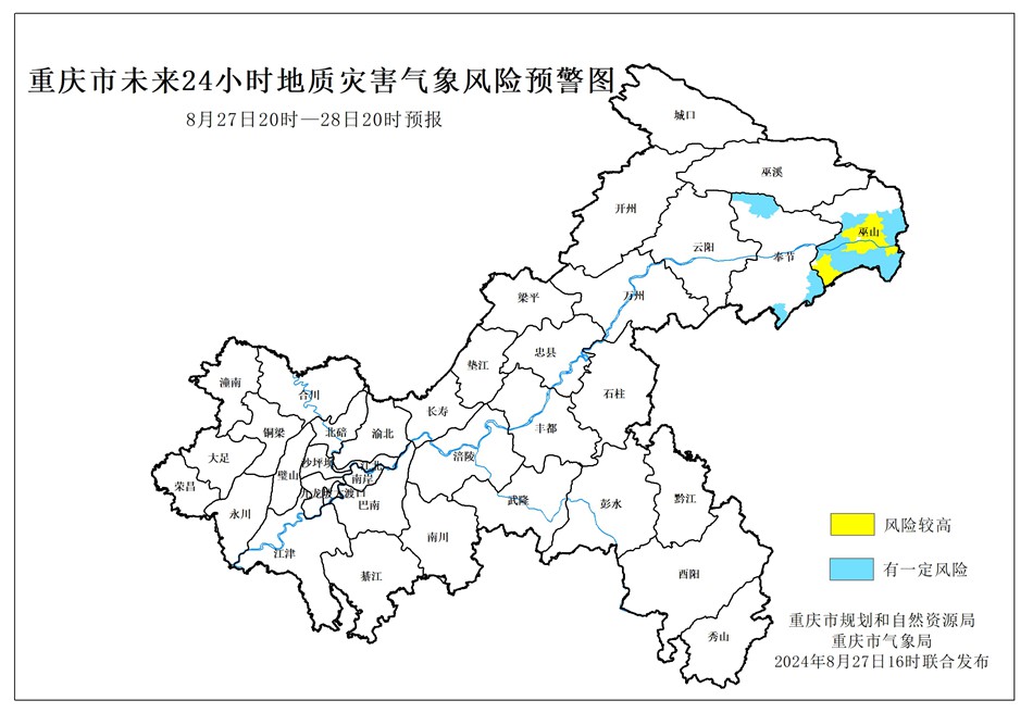8月27日20時至8月28日20時,巫山縣屬于風險較高地區,地質災害氣象風險等級為III級(黃色預警),奉節縣屬于有一定風險地區,地質災害氣象風險等級為IV級(藍色預警),請相關區縣注意防范。
