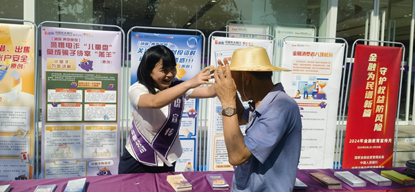 光大銀行重慶分行志愿者為市民送上印有防詐宣傳語的實用草帽。光大銀行重慶分行供圖